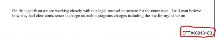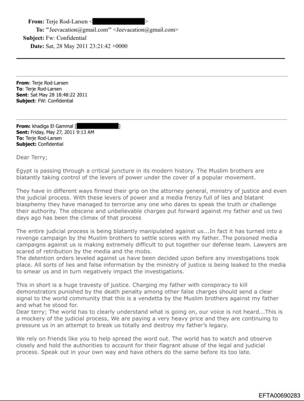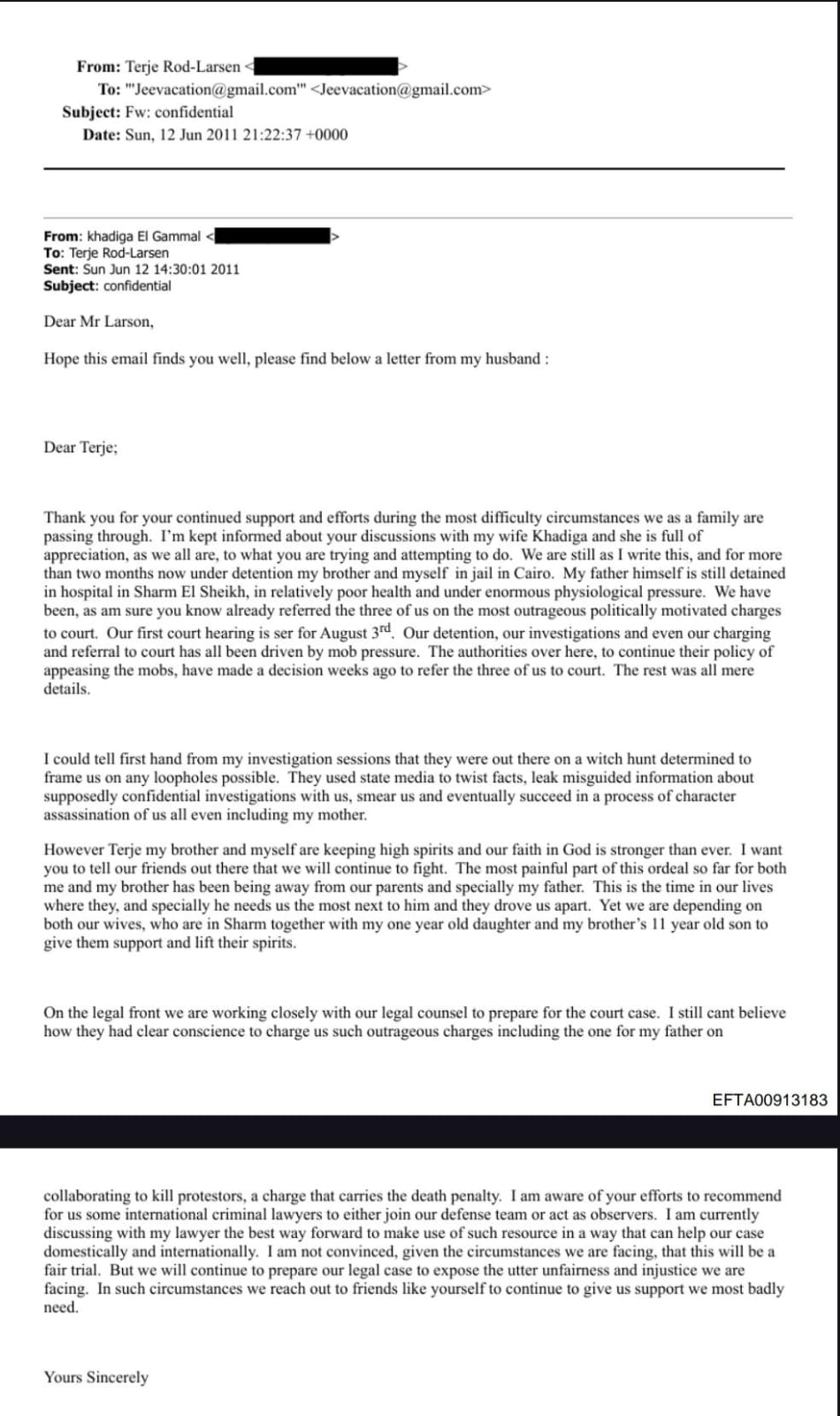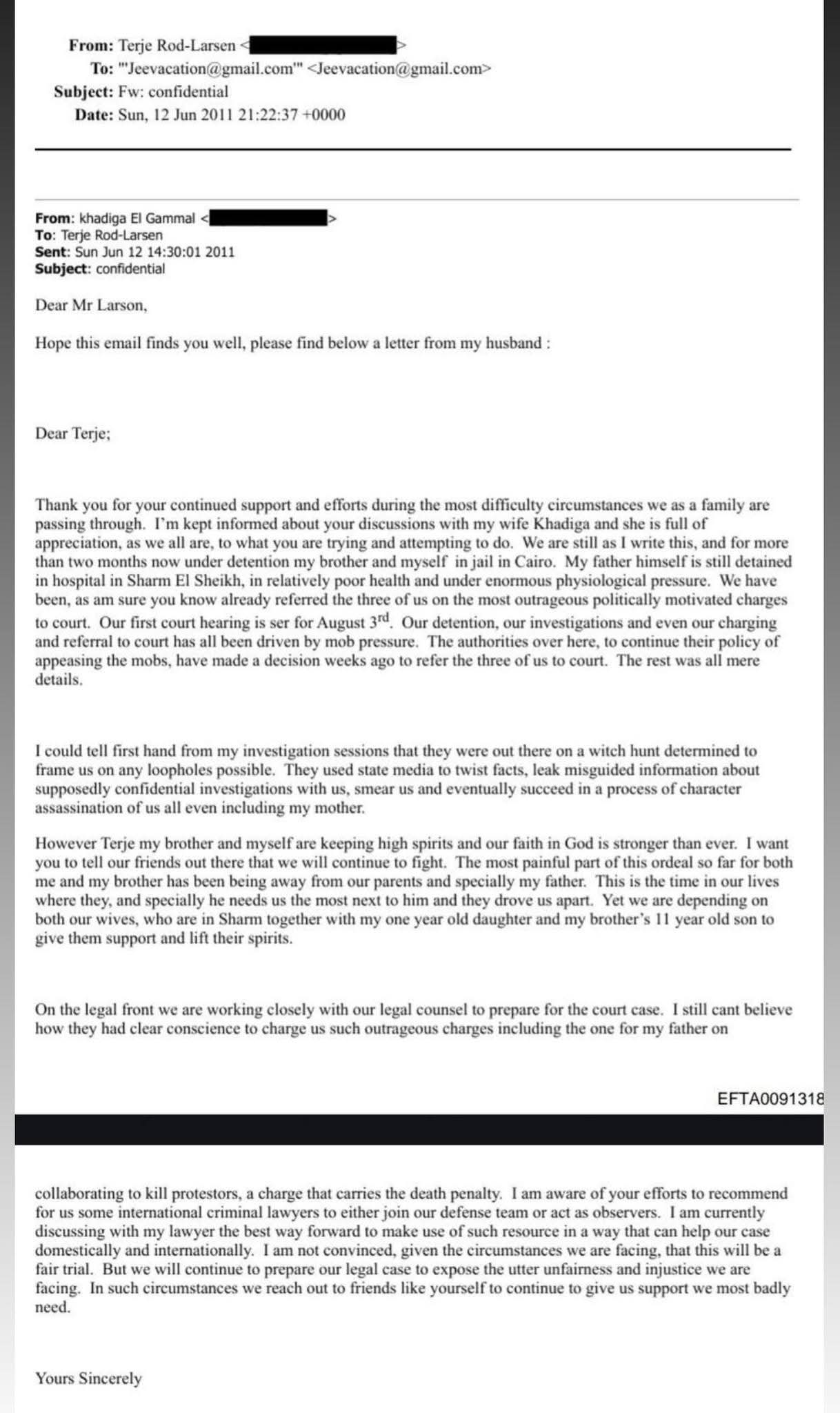 تضمنت الرسالة المؤرخة بـ1 يونيو 2011 وتحمل كود (EFTA02023766) إخطارًا بتحديد يوم 3 أغسطس موعدًا لمحاكمة الرئيس الأسبق ونجليه، مع الإشارة إلى حالة القلق والخوف التي تعيشها الأسرة.