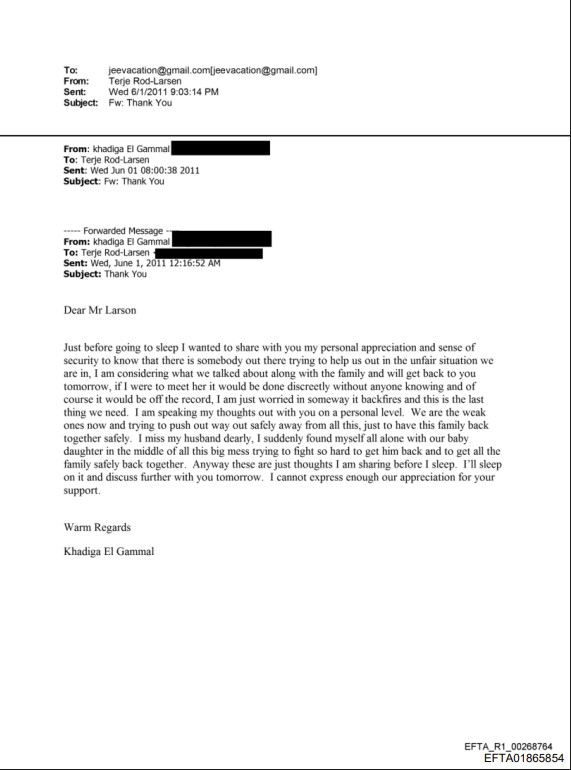 اتخذت الرسالة المؤرخة بـ1 يونيو 2011 وتحمل كود (EFTA00911510) طابعًا شخصيًا وإنسانيًا أكثر، حيث أعربت خديجة الجمال عن امتنانها للدعم الذي تتلقاه، وشعورها بالأمان لوجود من يحاول المساعدة من الخارج.