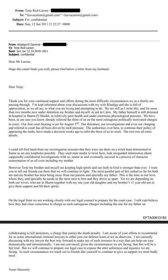 تضمن إيميل خديجة الجمال بتاريخ 12 يونيو لعام 2011 يحمل كود (EFTA00913183) رسالة مطولة من زوجها جمال مبارك، شملت تفاصيل أوضاع الاحتجاز، حيث أشار إلى احتجازه وشقيقه علاء في السجن بالقاهرة، بينما يخضع والده للعلاج في مستشفى بشرم الشيخ.