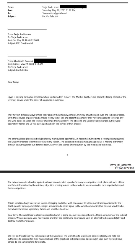 الوثيقة المنتشرة عبارة عن نص لرسالة عبر الإيميل مرسل من خديجة الجمال إلى رود لارسن، تتناول الأوضاع النفسية والصحية لجمال مبارك وشقيقه علاء، عقب إلقاء القبض عليهما بعد ثورة يناير 2011 وطلبهما الدعم.