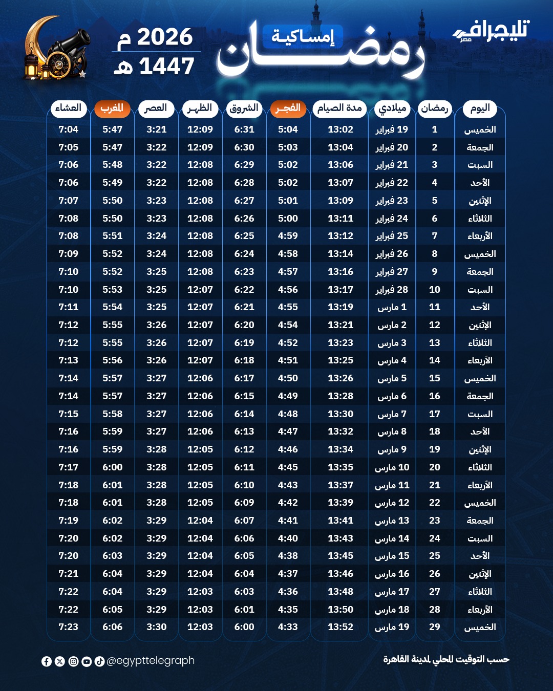 وجاءت إمساكية شهر رمضان 2026 في القاهرة بالكامل كالتالي: