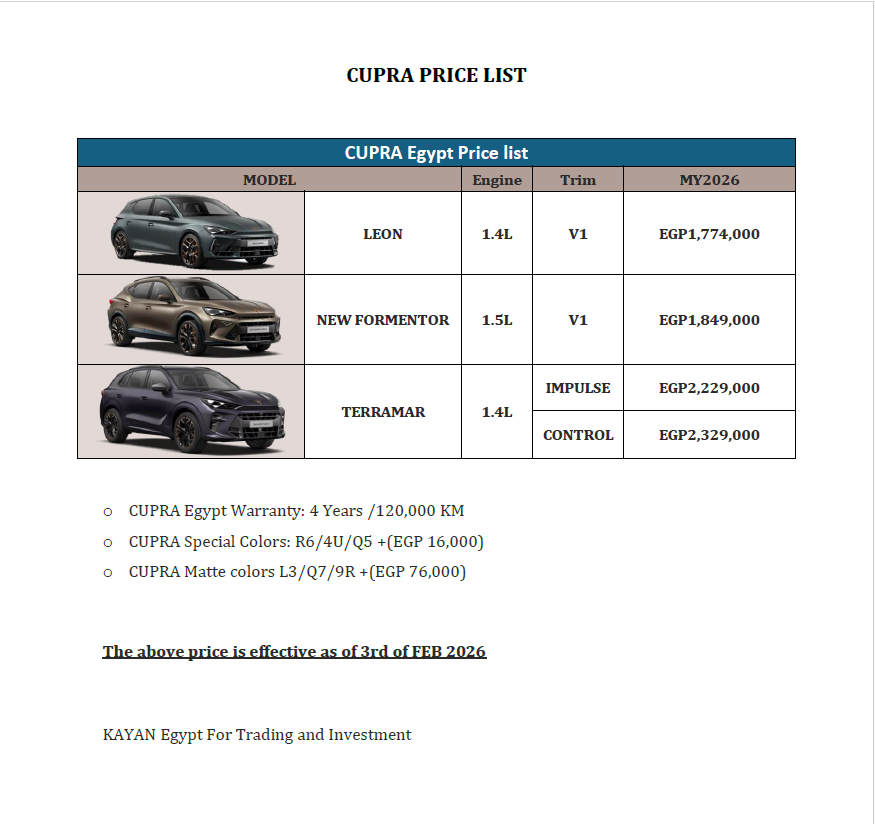 | NEW FORMENTOR | مليون و849 ألف جنيه |