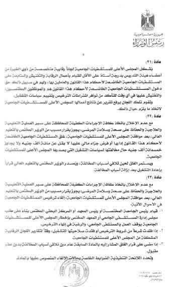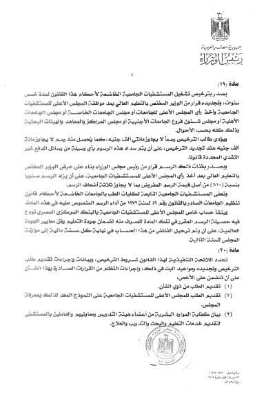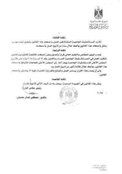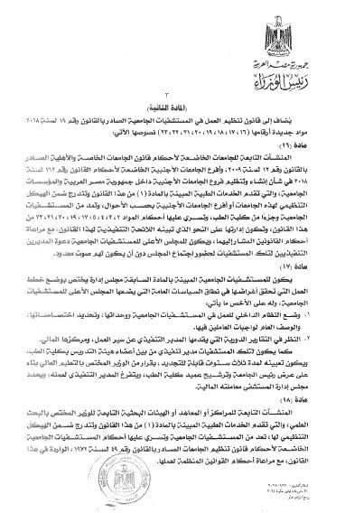 وشمل المشروع إخضاع المستشفيات التابعة للجامعات الخاصة والأهلية وفروع الجامعات الأجنبية، وكذلك المنشآت الطبية التابعة للمراكز والمعاهد البحثية، لأحكام قانون المستشفيات الجامعية، بما يضمن توحيد معايير الجودة والرقابة على جميع الجهات المقدمة للخدمة الطبية التعليمية.