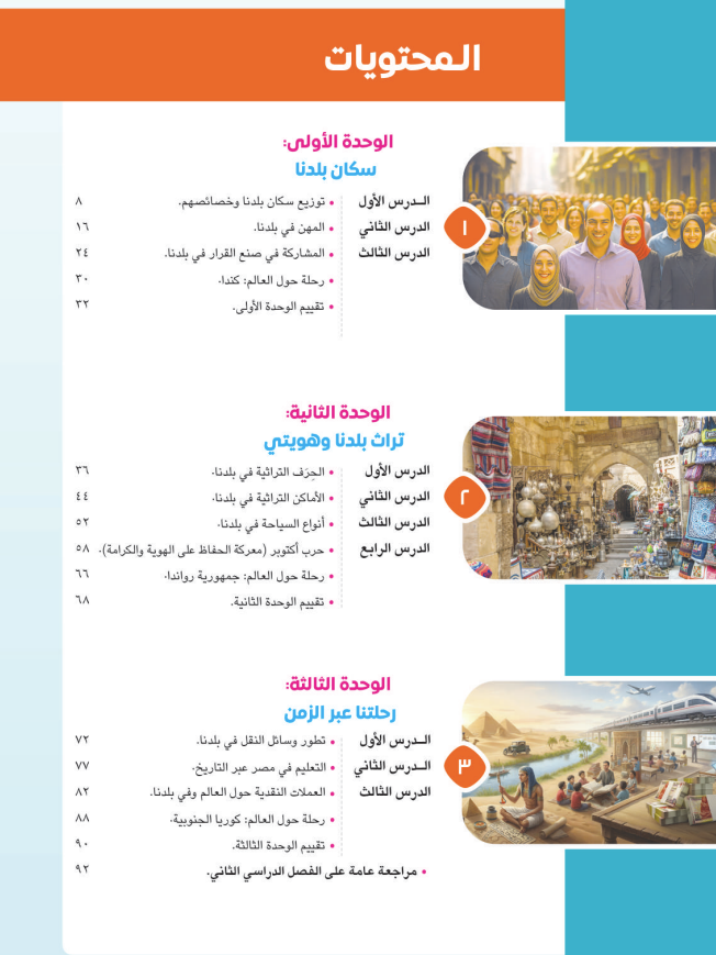 ويتكون منهج الدراسات الاجتماعية للصف الرابع الابتدائي الفصل الدراسي الثاني 2026 من ثلاث وحدات رئيسية وهي: