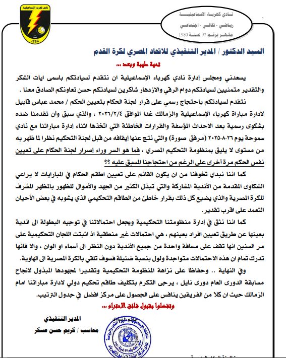 قدم نادي كهرباء الإسماعيلية احتجاجًا رسميًا إلى الاتحاد المصري لكرة القدم، اعتراضًا على تعيين الحكم محمد عباس قابيل لإدارة مباراته المقبلة أمام الزمالك.