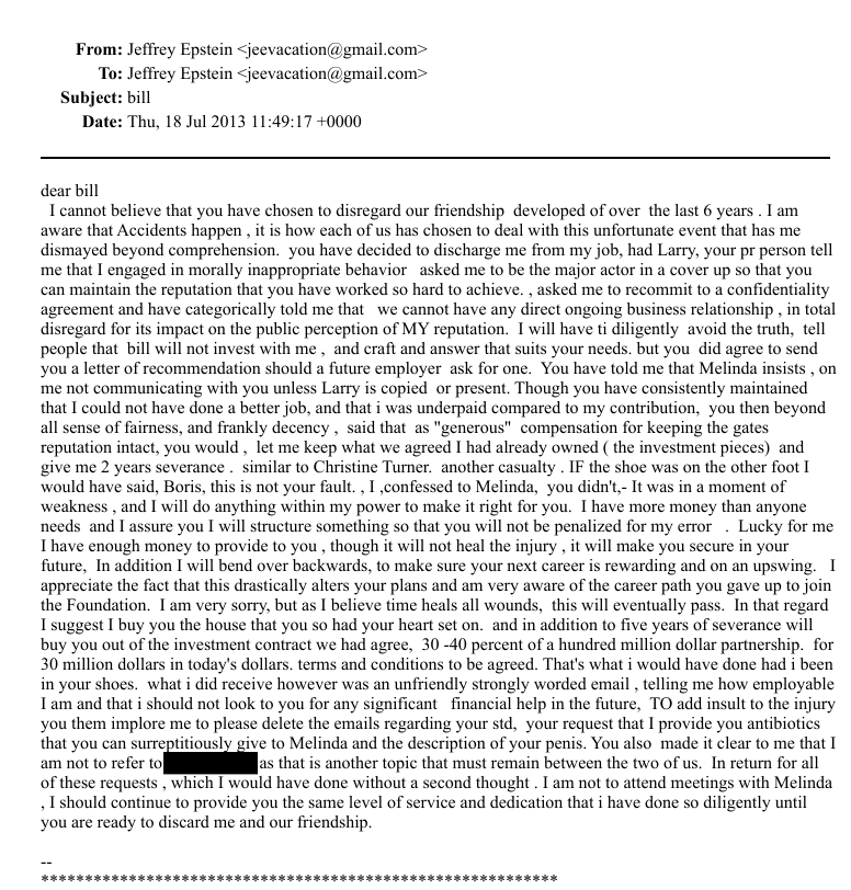 وجاء في إحدى الرسائل الغاضبة المنسوبة لإبستين أنه طلب من جيتس حذف رسائل إلكترونية تتعلق بمرضه، وتوفير مضادات حيوية لإعطائها سرًا لزوجته، مع ورود أوصاف شخصية فجة ضمن المراسلات.