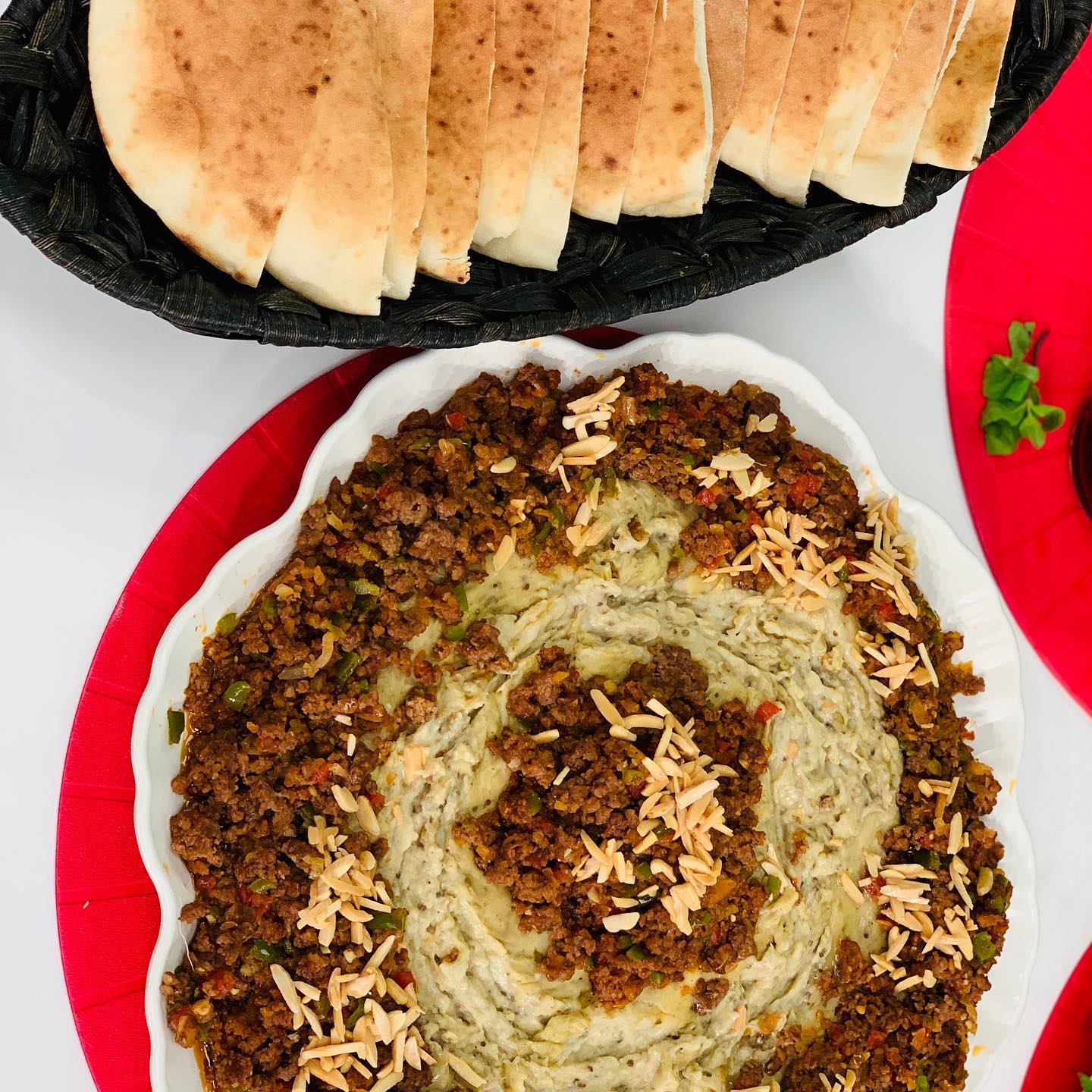 وفي وعاء آخر نقوم بإعداد اللحم المفروم مع الطماطم، وفي طبق التقديم، نضع خليط الباذنجان وفوقة اللحم وتزين بالبقدونس والصنوبر.