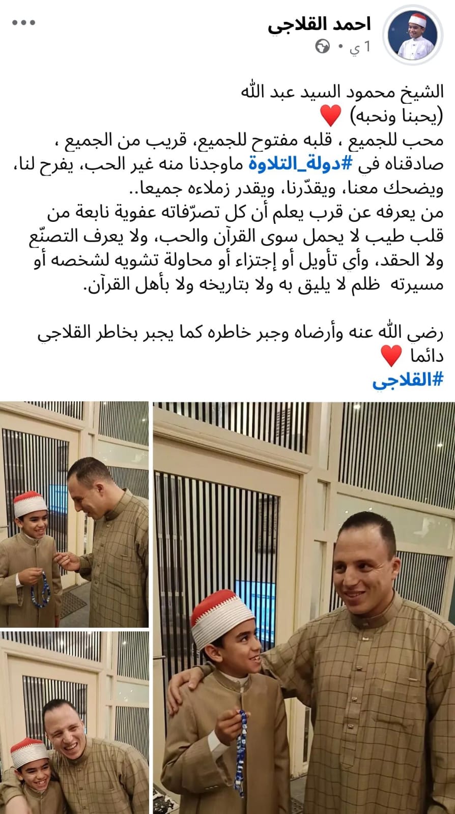 وتابع القلاجي إن "من يعرفه عن قرب يدرك أن جميع تصرفاته طبيعية وعفوية، نابعة من قلب طيب صافي، لا يحمل سوى حب القرآن والمحبة للناس”، مضيفا إن أي محاولة لتأويل كلامه أو تشويه مسيرته تعد ظلمًا لا يليق به، ولا بتاريخ حياته، ولا بأهل القرآن.