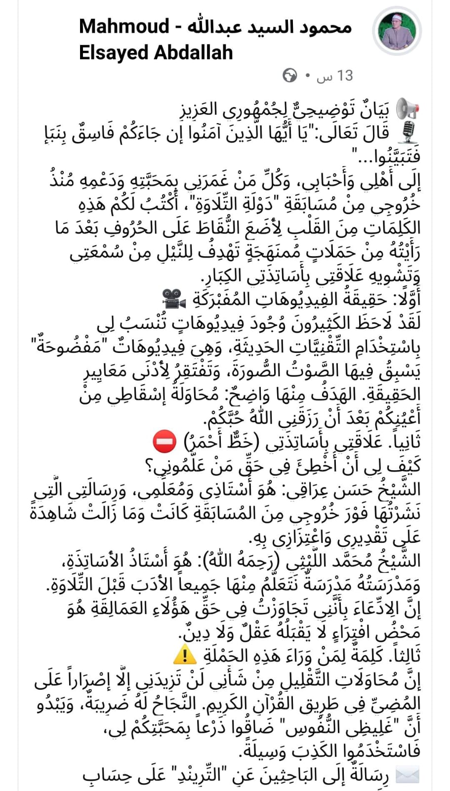 وشدد على أن حق أساتذته "خط أحمر"، وأنه لن يتجاوز في حق من علموه، وأوضح تقديره الكامل للشيخ حسن عراقي، وإن رسالته المنشورة فور خروجه من مسابقة "دولة التلاوة" شاهدة على اعتزازه به، وكذلك للشيخ محمد الليثي، الذي وصفه بأنه "أستاذ الأساتذة" وأن مدرسته تعلم الأدب قبل التلاوة، وأن أي ادعاء بتجاوزه في حق هؤلاء هو افتراء لا يقبله عقل ولا دين.