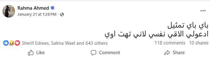 يذكر أن الفنانة رحمة أحمد أثارت حالة من الجدل خلال الشهر الماضي، بعد نشرها منشورًا عبر صفحتها الرسمية على “فيسبوك” قالت فيه: "باي باي تمثيل… ادعولي ألاقي نفسي لأني تهت أوي"، ما دفع بعض رواد مواقع التواصل الاجتماعي إلى تداول شائعات حول اعتزالها التمثيل بسبب ارتدائها الحجاب.
