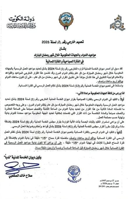 وأوضح القرار استنادا إلى القرار الخارجي رقم (1) لسنة 2024 بشأن مواعيد العمل في رمضان، وتصميم ديوان الخدمة المدنية رقم (12) لسنة 2024 الخاص بنظام العمل الرسمي في الفترة المسائية.