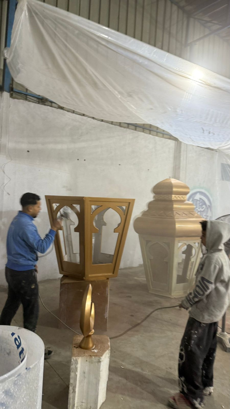 لم يكن إنتاج فانوس بهذا الحجم والتفاصيل الدقيقة أمرًا هينًا، خاصة باستخدام خامة "الفايبر جلاس"، وهي عبارة عن مادة “الريزن” سائلة مدعمة بالألياف الصناعية والفايبر جلاس، ليمر الفانوس بمراحل متعددة بداية من تصنيع القوالب وحتى الدهانات واللمسات النهائية.