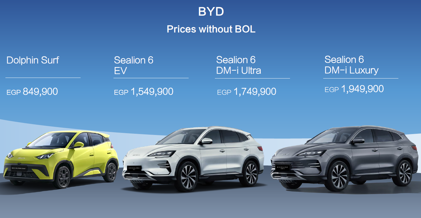 وفي فئة السيارات الهجينة، قدمت BYD طراز Sealion 6 DMi – Ultra، بسعر 1,749,900 جنيه مصري بتكنولوجيا ال DM Iوالذي توفر مدى قيادة إجمالي يصل إلى 1000 كيلومتر، مع مدى كهربائي 80 كيلومتر في وضع EV، وأداء إجمالي بقوة 260 حصان، إلى جانب تجهيزات فاخرة تشمل سقف بانوراما، شنطة كهربائية، وإضاءة داخلية Ambient Lighting .