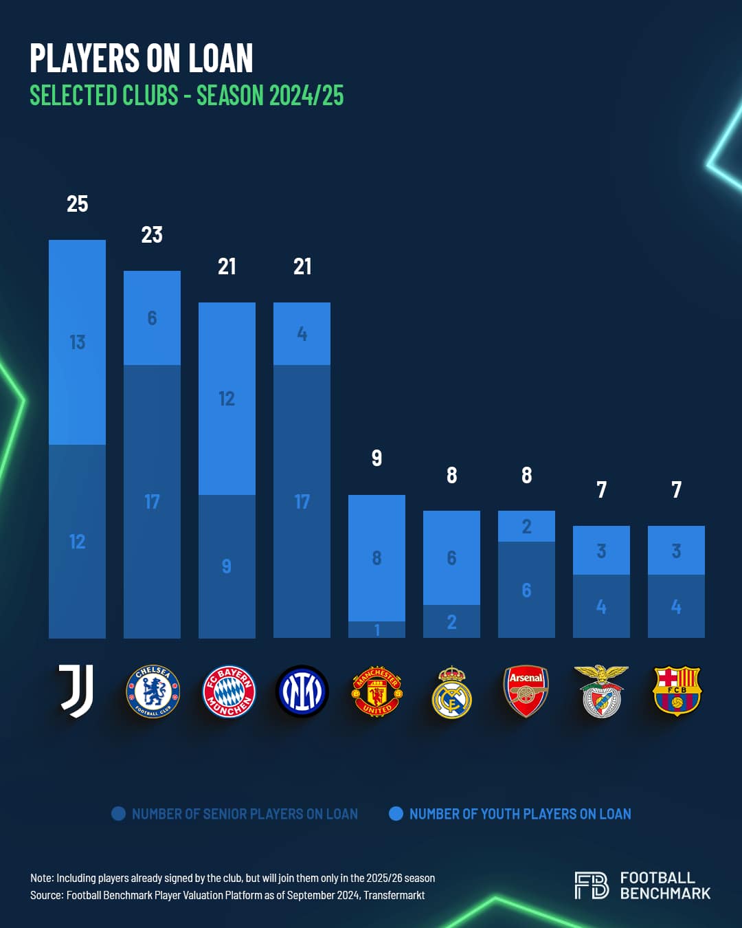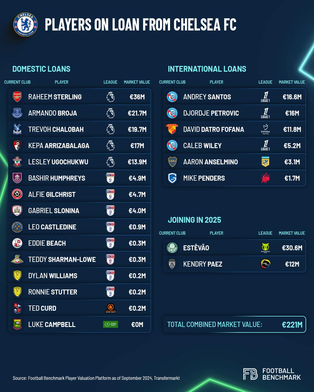 وفي أكتوبر 2024، كان لدى تشيلسي 23 لاعبًا معارًا، بقيمة سوقية إجمالية تبلغ 221 مليون يورو، وكان هذا الرقم حينها أعلى من القيمة الإجمالية لبعض فرق دوري أبطال أوروبا مثل سيلتيك وجيرونا.