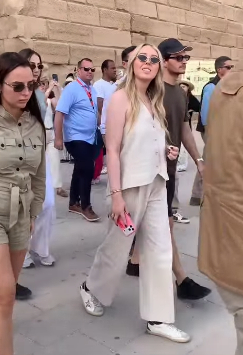 وخلال الجولة داخل الكرنك، توقفت تيفاني ترامب عند البحيرة المقدسة، حيث حرصت على التعرف على قصتها التاريخية، وشاركت في الطقس الشائع بين السائحين بالدوران حول الجعران المقدس وتمني الأمنيات، في مشهد عكس تفاعلها مع المكان وروحه التاريخية.