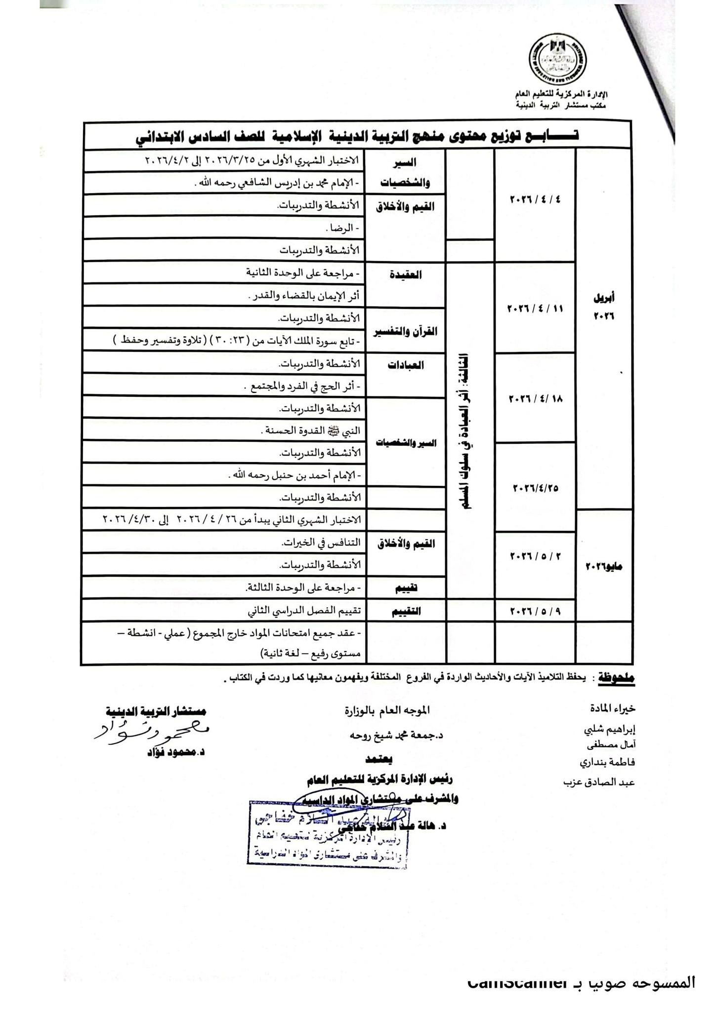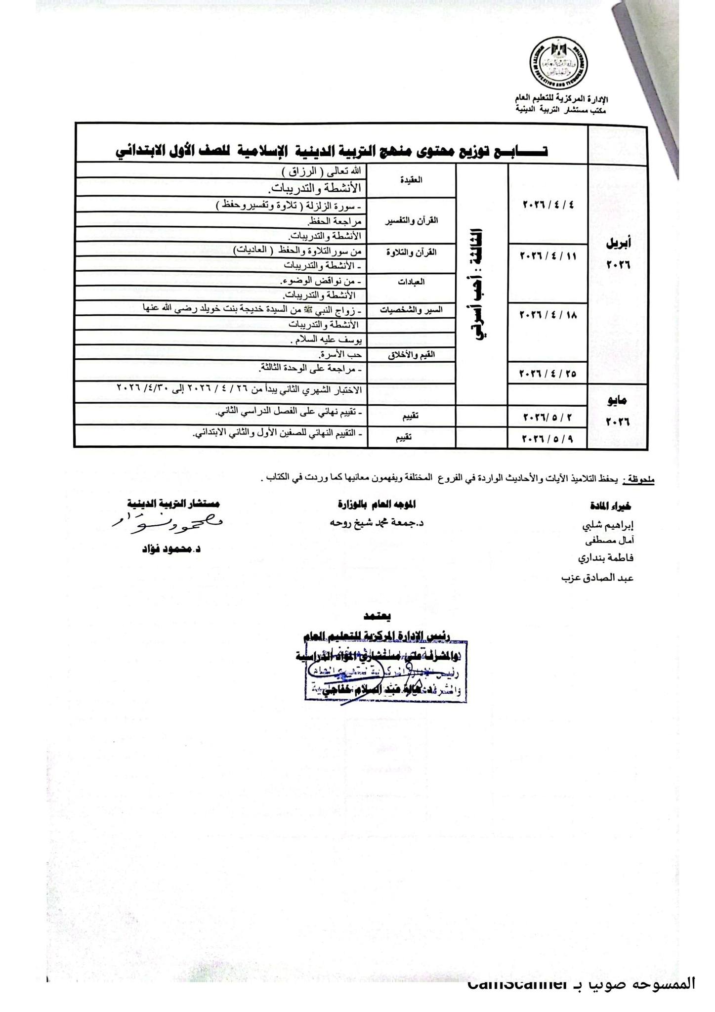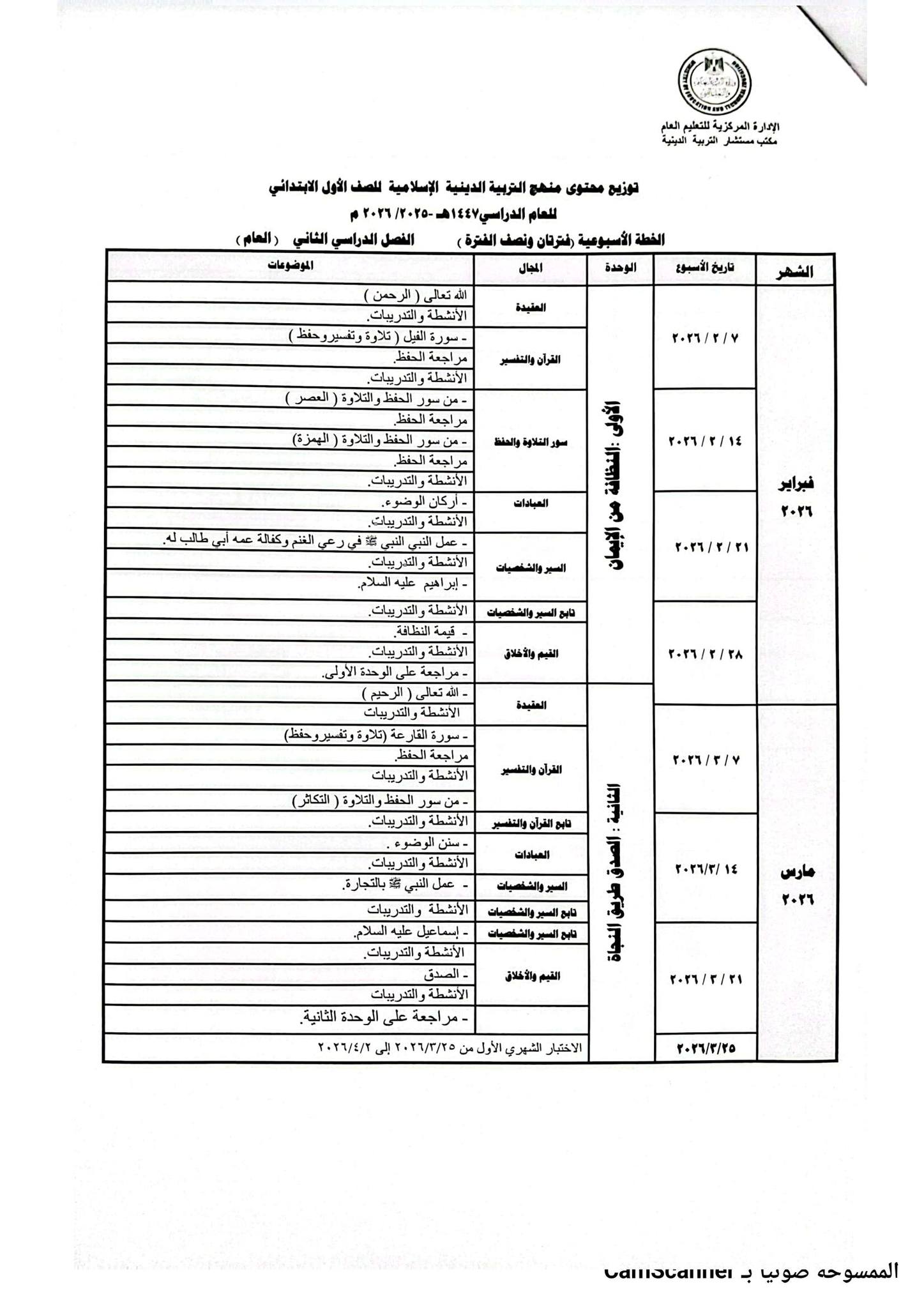 يستطيع المعلمون والطلاب الاطلاع على توزيع منهج التربية الدينية للصف الأول الابتدائي 2026 الترم الثاني من خلال الصور التالية :