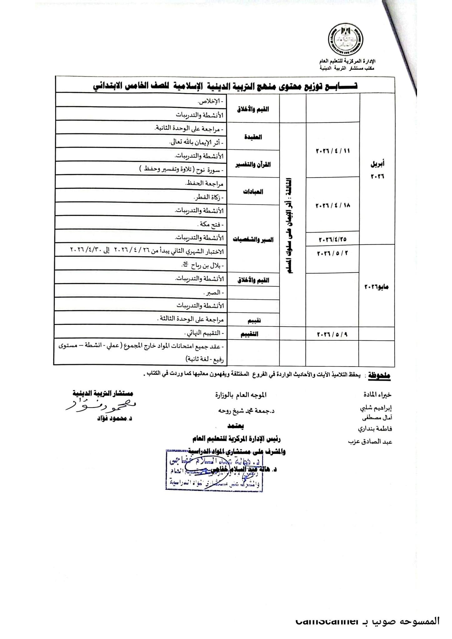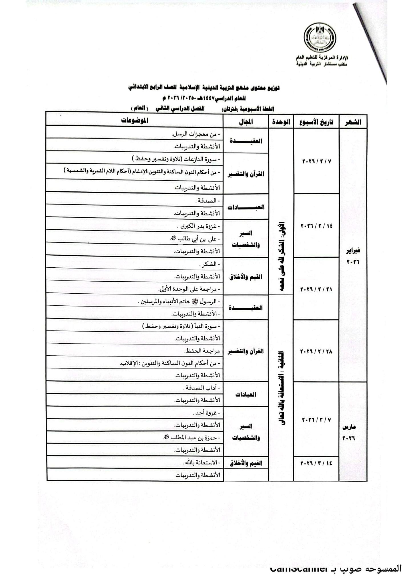 وتوضح الصور التالية أيضًا توزيع منهج التربية الدينية للصف الرابع الابتدائي 2026 الترم الثاني: