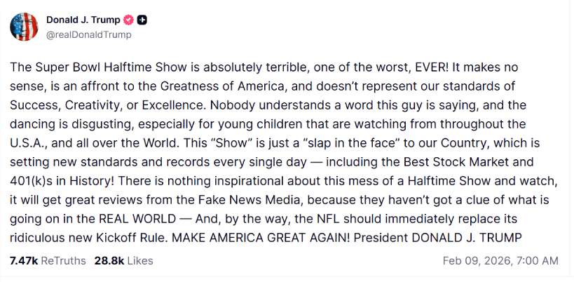 وكتب ترامب على المنصة: “عرض ما بين الشوطين في مباراة السوبر بول سيء للغاية، إنه من أسوأ العروض على الإطلاق، لا معنى له، وهو إهانة لعظمة أمريكا، ولا يمثل معاييرنا في النجاح أو الإبداع أو التميز”.