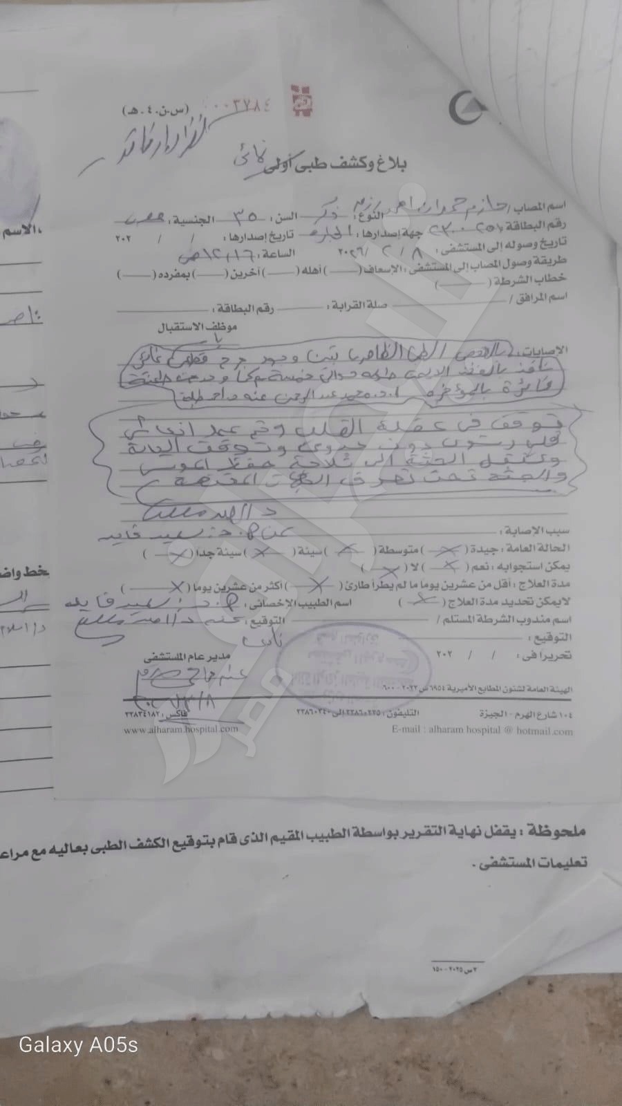وأفاد التقرير الطبي، أن المجني عليه يبلغ من العمر 35 سنة وصل إلى استقبال المستشفى بواسطة "الأهالي".