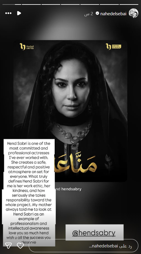ونشرت ناهد السباعي صورة هند صبري من بوستر “منّاعة” عبر حسابها على منصة “إنستجرام” معلقة عليها: “هند صبري من أكثر الممثلات التزامًا واحترافية ممن عملت معهم”.