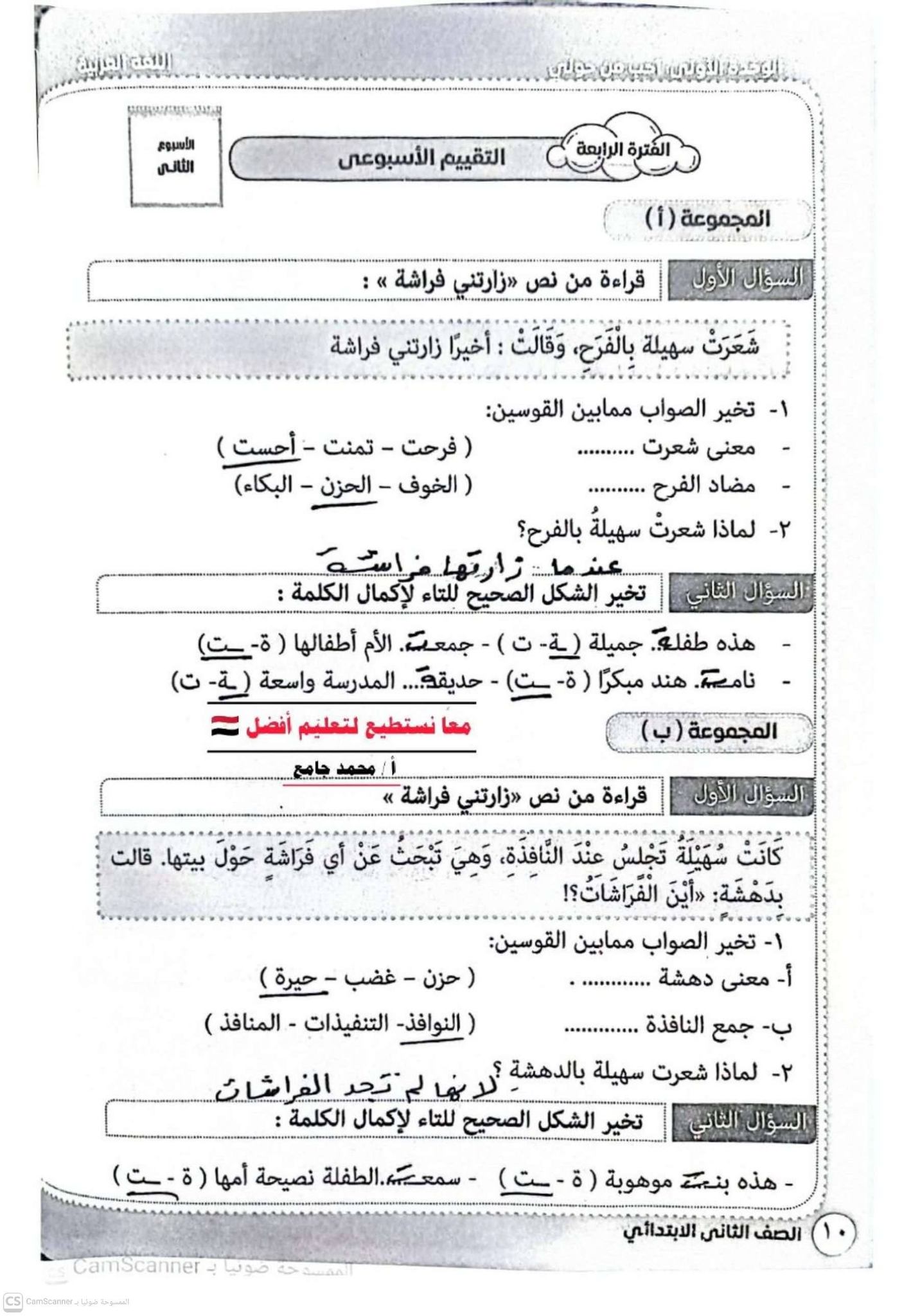 حل تقييم اللغة العربية للصف الثاني الابتدائي الترم الثاني 2026