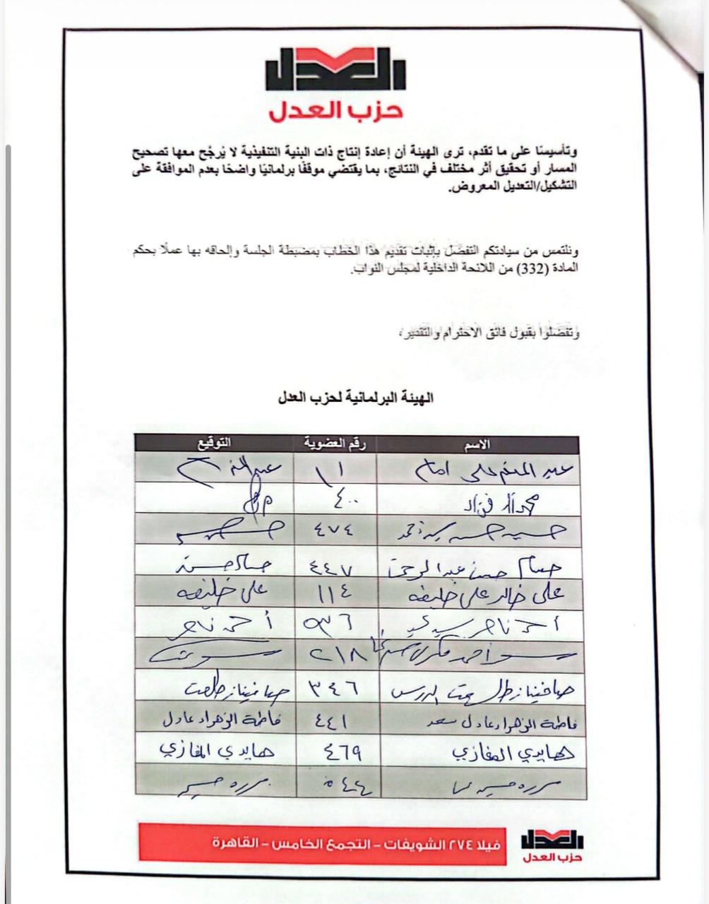 أعلنت الهيئة البرلمانية لحزب العدل بكامل أعضائها رفضها الموافقة على التعديل الوزاري على حكومة مصطفى مدبولي، الذي جرى التصويت عليه بالمجلس.