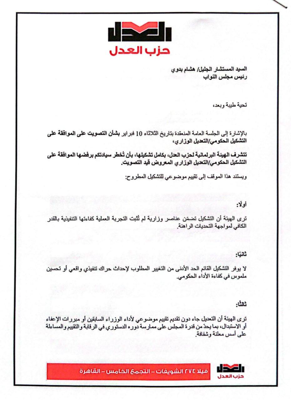 وتقدم نواب الحزب قد تقدموا بخطاب لرئيس المجلس بمبررات رفض التعديل، والمطالبة بإثبات تقديمه بالمضبطة الجلسة وإلحاقه بها عملًا بحكم المادة (332) من اللائحة الداخلية لمجلس النواب، وجاءت رؤية الحزب الرافضة للتعديل الوزاري بناء على عدة محاور فصلها الحزب في خطابه.