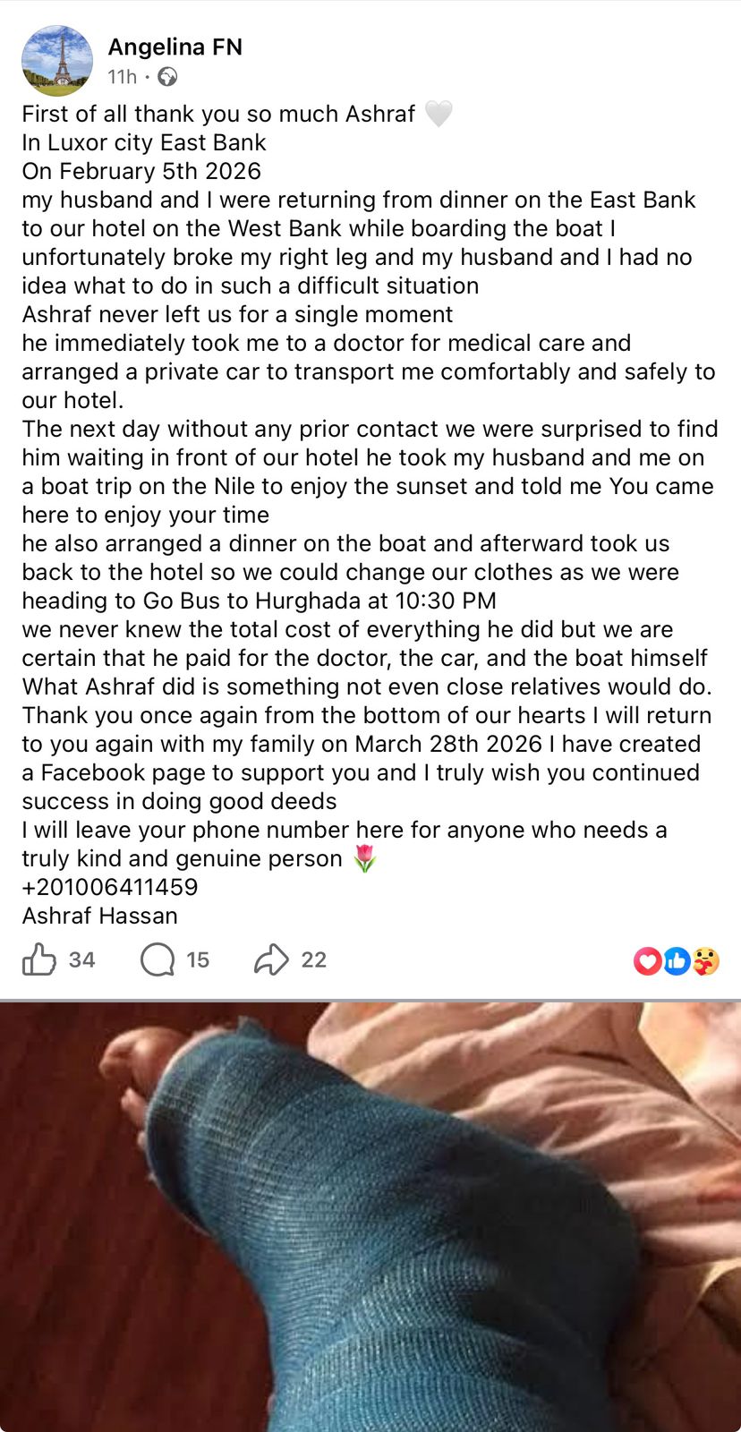 كما أعلنت عزمها العودة إلى الأقصر برفقة أسرتها في 28 مارس المقبل لزيارته وتقديم الشكر له شخصيًا، مشيرة إلى أنها أنشأت صفحة عبر موقع «فيسبوك» لدعمه تقديرًا لما أبداه من شهامة وإنسانية.