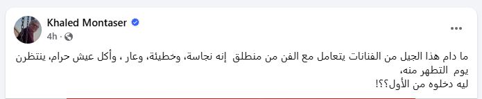 عبّر خالد منتصر عن استيائه عبر حسابه الرسمي على موقع فيسبوك، متسائلًا: "طالما أن هذا الجيل من الفنانات ينظر إلى الفن باعتباره نجاسة أو خطيئة أو عارًا وأكل عيش حرام، وينتظرن لحظة التطهر منه، فلماذا دخلنه من الأساس؟"