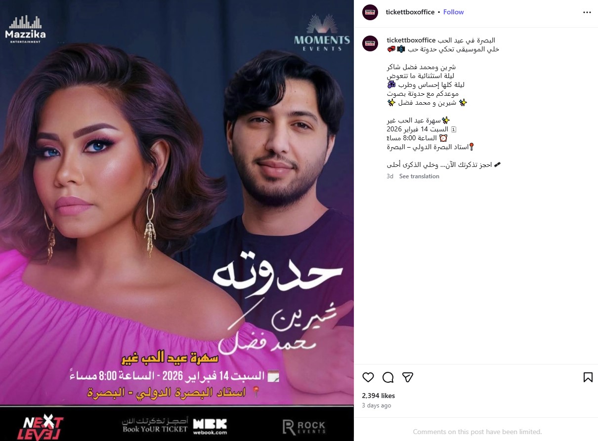 أعلنت إحدى الصفحات المنسوبة لشركات تنظيم الحفلات عن إقامة حفل يجمع الفنانة شيرين عبدالوهاب والفنان محمد فضل شاكر، احتفالًا بعيد الحب يوم 14 فبراير، على أن يُقام الحفل في استاد البصرة الدولي بالعراق.