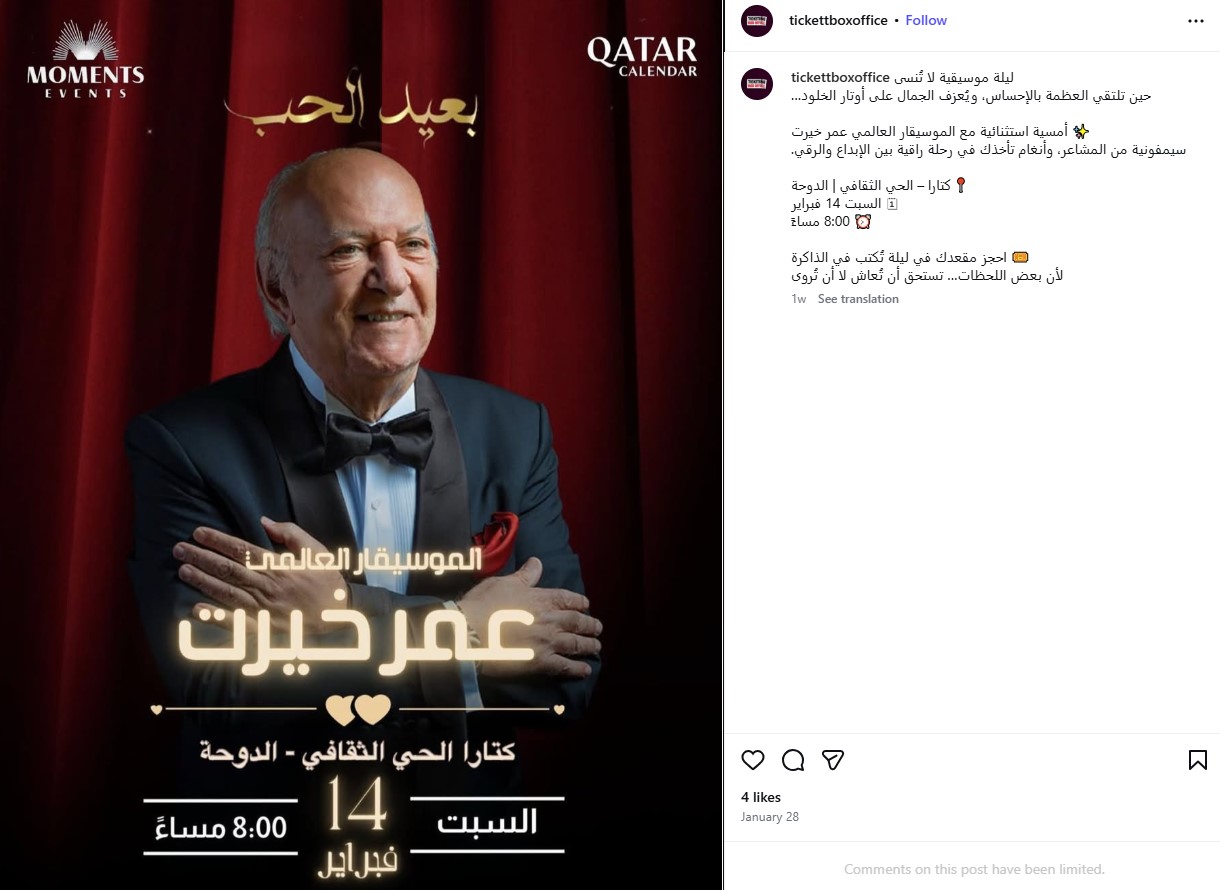 وبحسب ما أعلنته شركة تنظيم الحفلات «تذكرتي»، فإن الموسيقار عمر خيرت يستعد لإحياء حفل بدار الأوبرا المصرية في الموعد نفسه ضمن فعاليات عيد الحب، ما يؤكد زيف الإعلان المتداول بشأن حفل الدوحة.