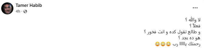 بينما كتب تامر حبيب عبر حسابه على “فيسبوك”: “لا والله، فعلًا؟، وطالع تقول كده وأنت فخور؟.. هو ده بجد؟، رحمتك يا رب”.