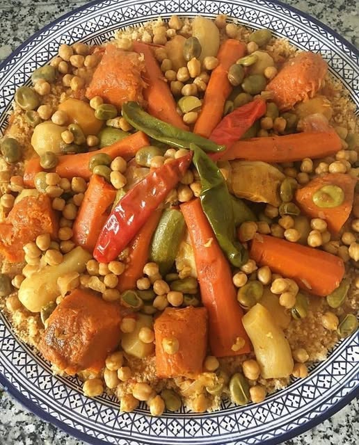 - يُحضّر الكسكس حسب التعليمات ويُقدم مع الخضار والدجاج.