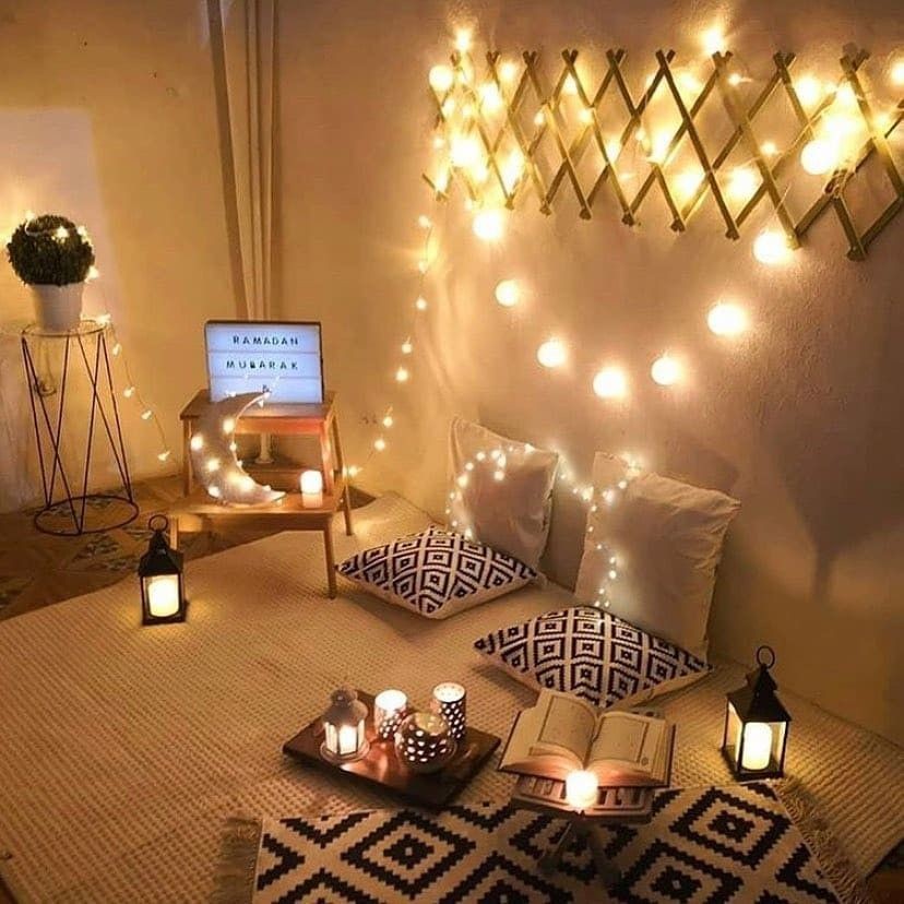 إضافة لمبات صغيرة أو شريط LED حول الأرائك أو فوق الأرفف يخلق أجواء دافئة ومبهجة، بالإضافة إلى يمكن دمج الألوان الدافئة مثل الأصفر والبرتقالي لتعكس شعور رمضان الروحاني.