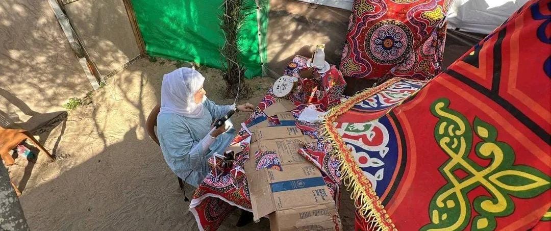 وأضافت قائلة:" طلعت من الخيمة بالمشغولات اليدوية ومستسلمتش للواقع اللي أنا عايشاه رغم إني خسرت عفشي وبيتي وأغراضي ولكن من قلب الخمية الحمد لله قدرت أطلع وأبين نفسي خاصة إنه أيدي قادرة تطلع شغل".