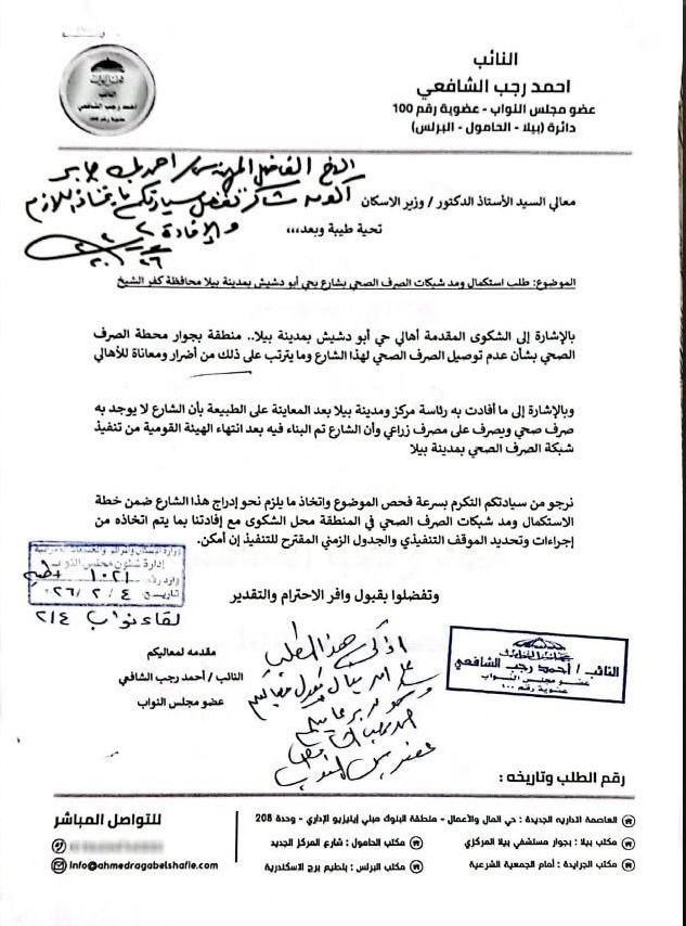 وطالب النائب بسرعة فحص الموضوع واتخاذ ما يلزم لإدراج هذا الشارع ضمن خطة استكمال ومد شبكات الصرف الصحي بالمنطقة محل الشكوى، مع تزويده بالإجراءات المتخذة والموقف التنفيذي، بالإضافة إلى تحديد الجدول الزمني المتوقع لتنفيذ الأعمال، إن أمكن".