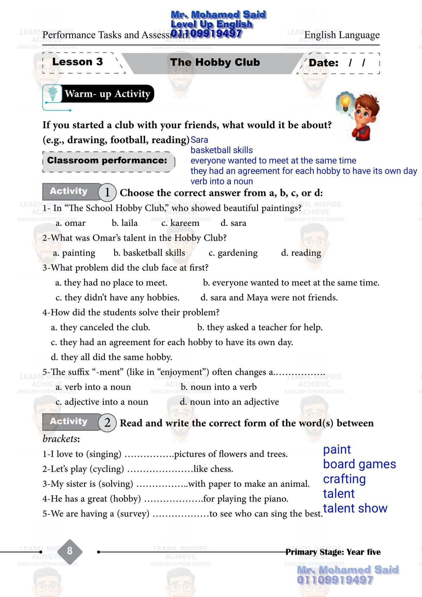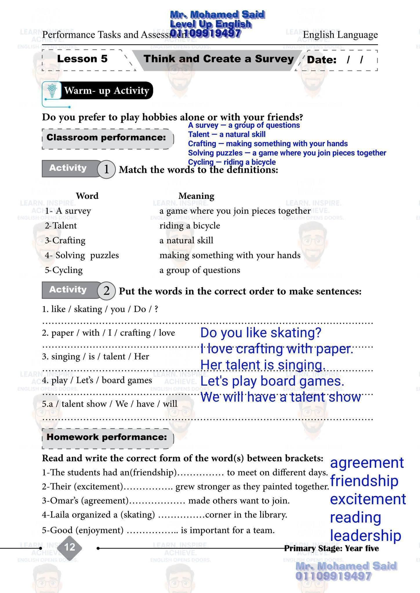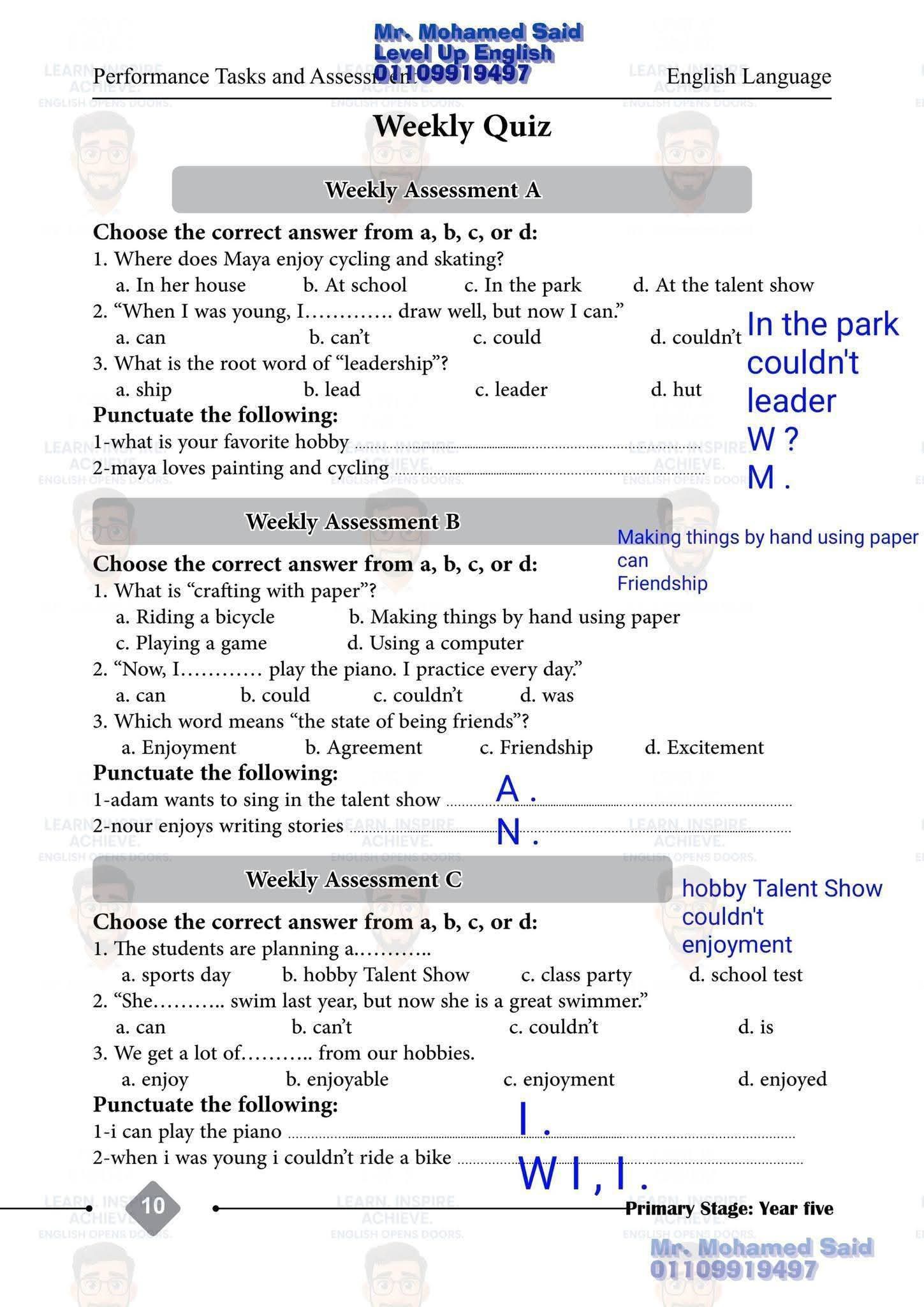 حل كتاب التقييمات للصف الخامس الابتدائي انجليزي الترم الثاني