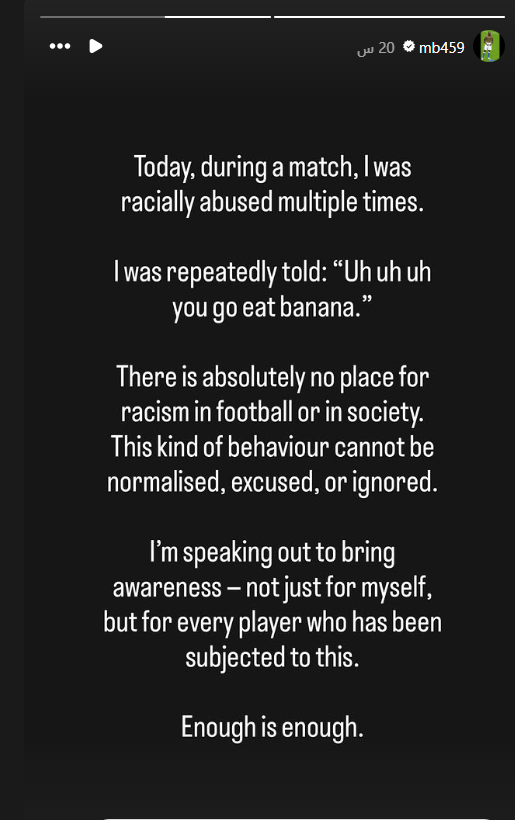 وكشف اللاعب عبر "إنستجرام"، تعرضه لهتافات عنصرية متكررة خلال اللقاء، تضمنت عبارات مسيئة مثل: "اذهب وكل موزة"، مؤكدًا أن مثل هذه التصرفات غير مقبولة إطلاقًا، سواء داخل الملاعب أو في المجتمع بشكل عام.