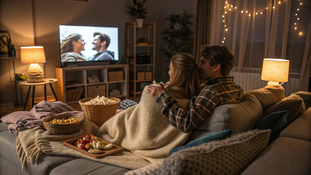 يفضل اختيار عدة أفلام رومانسية أو كوميدية تستمتع الزوجان بمشاهدتها معًا، كما يمكن تجهيز بعض الوجبات الخفيفة، وسيُضفي وضع البطانيات والوسائد جوًا دافئًا ومريحًا.