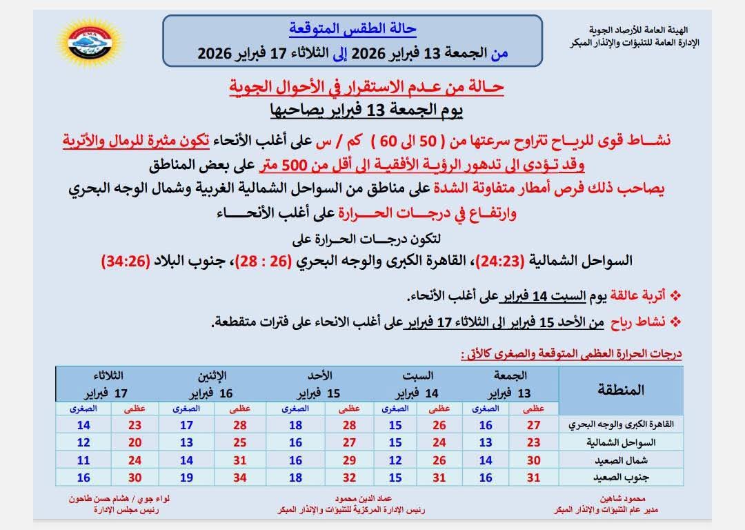 ويشهد طقس الايام القادمة حالة من عدم الاستقرار في الأحوال الجوية، بالإضاف إلى نشاط قوى للرياح تتراوح سرعتها من ( 50 الى 60 ) كم / س على أغلب الأنحاء تكون مثيرة للرمال والأتربة
