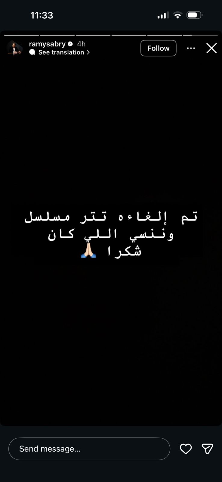 وكتب رامي عبر خاصية “الاستوري” على حسابه الرسمي بمنصة “إنستجرام”: “تم إلغاء تتر مسلسل وننسى اللي كان.. وشكرًا”، دون كشف تفاصيل إضافية بشأن أسباب الإلغاء.
