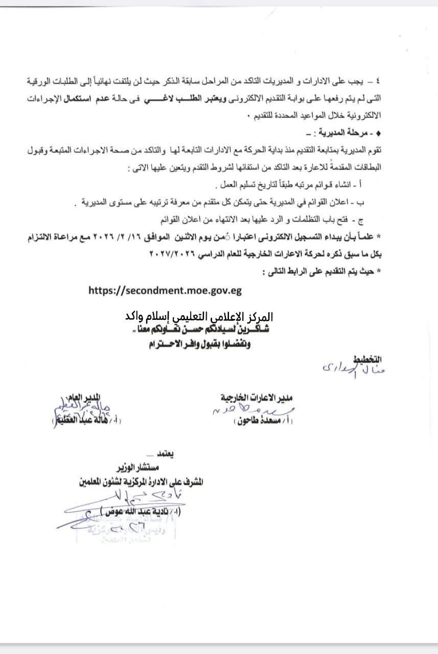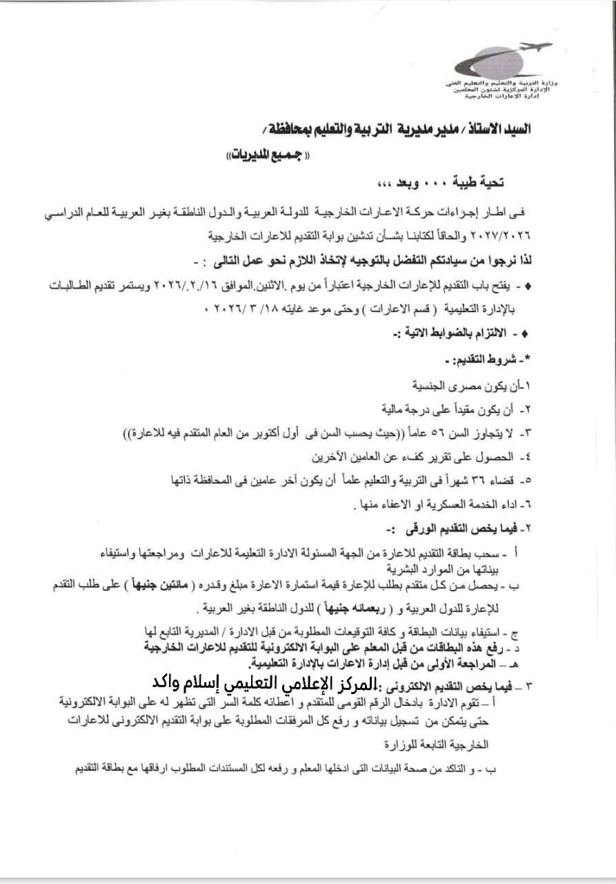 وأوضحت وزارة التعليم، في الخطاب المرسل للمديريات التعليمي، أنه سيتم فتح باب التقديم للإعارات الخارجية اعتبارا من يوم الإثنين الموافق 16 فبراير 2026، ويستمر تقديم الطالبات بالإدلرى التعليمية (قسم الإعارات) وحتى موعد غايته 18 مارس 2026.