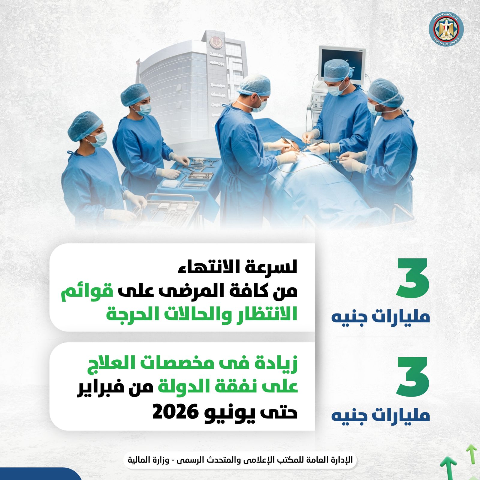 - قطاع الصحة: ضخ مبلغ إضافي للعلاج على نفقة الدولة في حدود 3 مليارات جنيه، و3 مليارات أخرى للقضاء على قوائم الانتظار، وأكثر من 3 مليارات لتبكير دخول محافظة المنيا ضمن منظومة التأمين الصحي الشامل اعتبارًا من أبريل القادم، حيث تضم المحافظة نحو 7 ملايين نسمة.