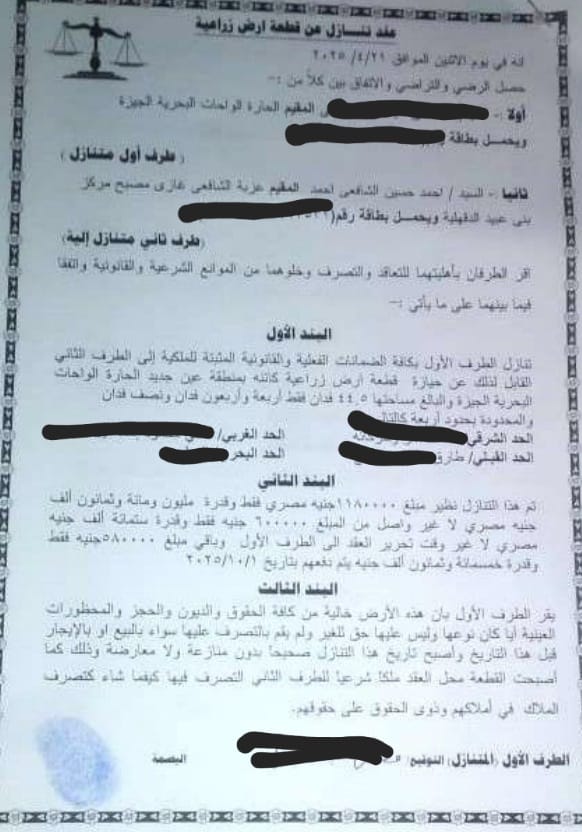 تعود الواقعة إلى بلاغ رسمي تقدم به المواطن "حسين الشافعي"، المقيم بمحافظة الدقهلية، أفاد فيه بقيامه بشراء قطعة أرض مساحتها 44 فداناً ونصف بقرية "الحارة" التابعة للواحات البحرية بمحافظة الجيزة، وذلك لصالح نجله.