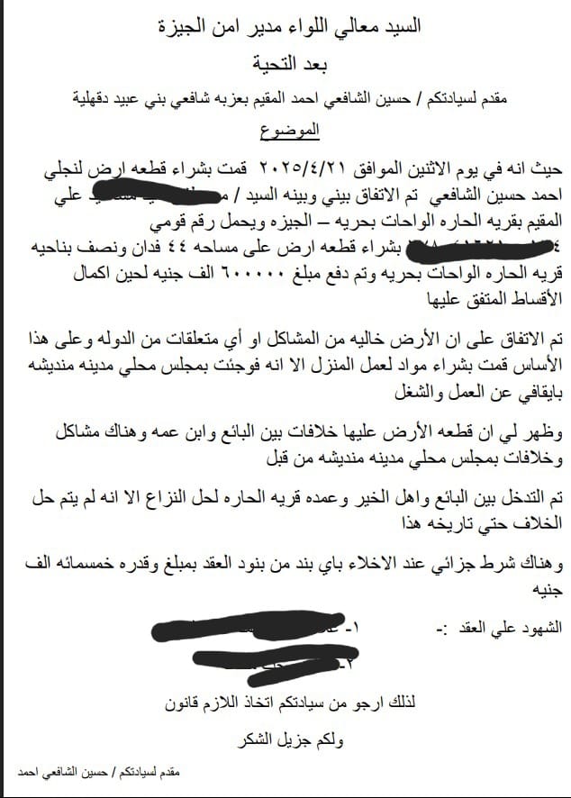 طالب مقدم البلاغ اللواء مدير أمن الجيزة باتخاذ الإجراءات القانونية اللازمة حيال المشكو في حقه، وحمايته من ضياع مستحقاته المالية، خاصة بعد ثبوت تعرضه لعملية تضليل بشأن الوضع القانوني للأرض.