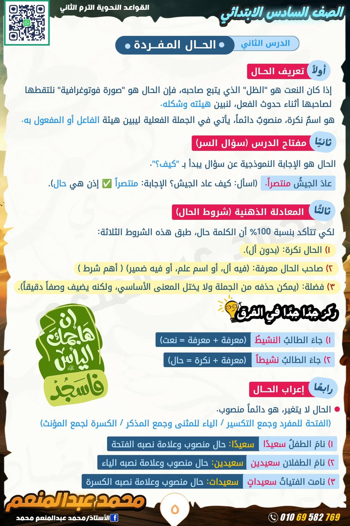 ويعد درس الحال ثاني دروس النحو للصف السادس الابتدائي الفصل الدراسي الثاني.