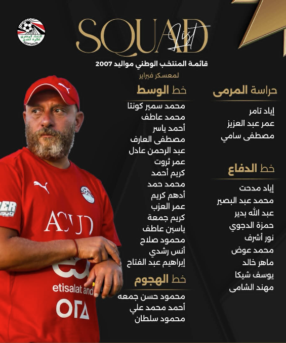 أعلن وائل رياض المدير الفني لمنتخب مصر للشباب “مواليد 2007” قائمة الفراعنة الصغار للمعسكر المقرر انطلاقه ثاني أيام شهر رمضان المبارك “20 فبراير” استعدادًا لخوض تصفيات بطولة كأس الأمم الأفريقية للشباب.