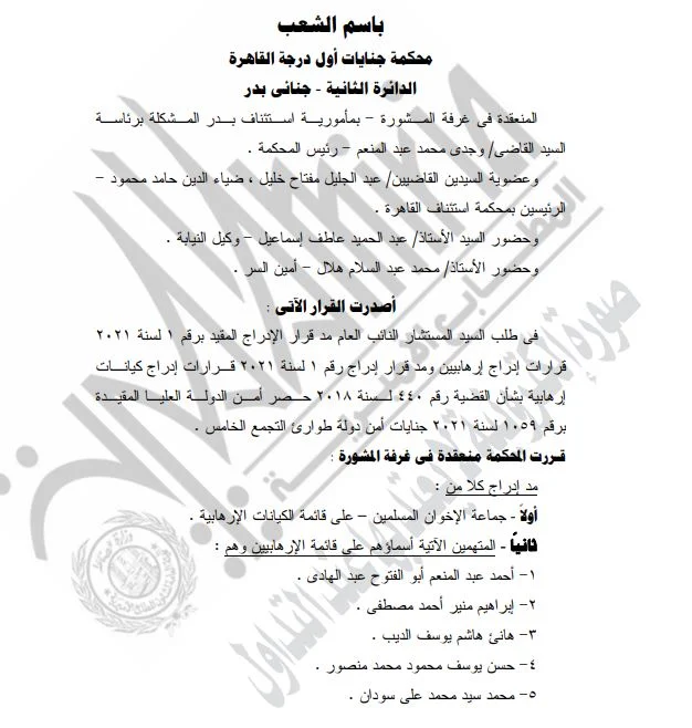 وشمل القرار مد إدراج جماعة الإخوان وعدد المتهمين على قائمة الإرهابيين وهم: