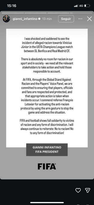 واختتم إنفانتينو بيانه بالقول: "إن الفيفا وعالم كرة القدم يظهران تضامنهما الكامل مع ضحايا العنصرية وأي شكل من أشكال التمييز، وسأستمر دائمًا في التأكيد على: لا للعنصرية، لا لأي شكل من أشكال التمييز".
