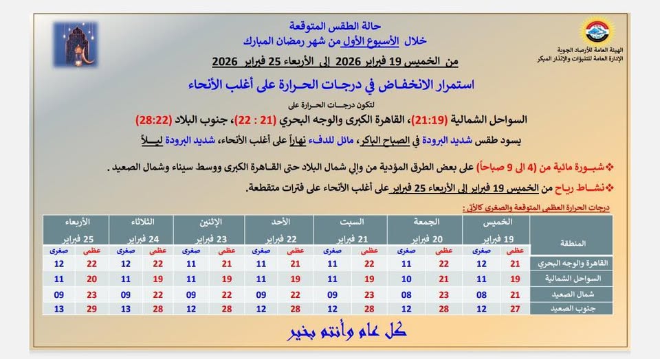 تُشير توقعات الهيئة العامة للأرصاد الجوية إلى أن حالة انخفاض درجات الحرارة ستستمر على أغلب أنحاء الجمهورية طوال الأسبوع الأول من رمضان 2026، حتى يوم الأربعاء 25 فبراير.